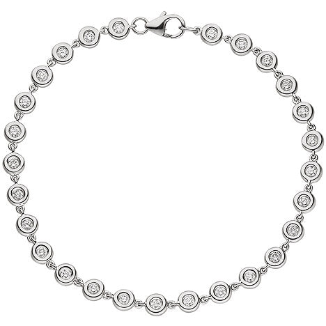 Tennisarmband aus 14 Karat (585) Weißgold mit 27 Diamant-Brillanten, 0,85 ct., W/SI wesselton (weiß), SI=(kleine, mit bloßem Auge nicht erkennbare natürliche Einschlüsse), Feinbearbeitung gut, mit Karabinerverschluss, Länge ca. 18 cm, Stärke ca. 4,5 mm x 1,6 mm, Gewicht ca. 7,5 g * Bitte beachten Sie die Maße! Auf dem Foto kann der Artikel größer wirken *(Colfem) Der Trend rund um Armschmuck ist ungebrochen. Mit diesem Armband setzt man tolle Akzente und kann auch mehrere Bänder geschickt kombinieren. Die Farbe Silber ist weltweit die beliebteste Schmuckfarbe. Die schlichte Eleganz macht silberfarbigen Schmuck zum modischen Allrounder. Silber passt immer! Gold 585, auch 14 Karat Gold genannt, ist in unseren Breiten die gängigste Wahl, wenn man Echtgold Schmuck sein eigen nennen möchte. Da reines Feingold 999 zu weich für die Schmuckverarbeitung ist, wird es mit anderen Metallen legiert. Bei 585 Gold besteht also die Legierung zu über die Hälte aus reinem Gold. Die Magie echter Schmucksteine verzaubert die Menschen schon immer. Schmuckstücke verziert mit echten Steinen sind etwas besonderes. Viele verbinden mit echten Steinen auch ganz besondere Bedeutungen. Wie keine andere Farbe steht Weiß für schlichte Eleganz. Weiß passt zu allem und sollte daher in keiner Schmuckschatulle fehlen.