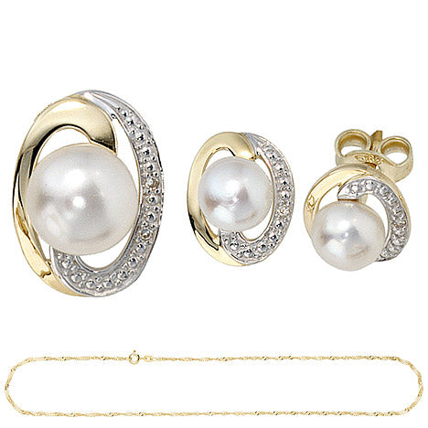 Schmuck-Set 585 Gelbgold bicolor 3 Perlen 4 Diamanten Ohrringe und Kette 45 cm