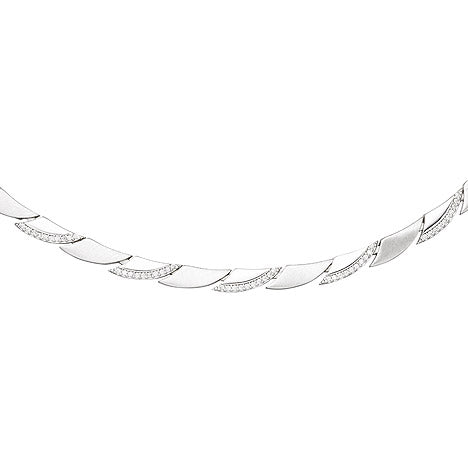 Collier / Halskette aus 925 Sterlingsilber, rhodiniert und teilmattiert, mit 210 Zirkonia und Karabinerverschluss, Länge ca. 45 cm, Kettenstärke ca. 4,6 mm x 2,8 mm, Gewicht ca. 25,6 g * Der Artikel ist anlaufgeschützt (rhodiniert) * Bitte beachten Sie die Maße! Auf dem Foto kann der Artikel größer wirken *(Colfem) Eine Kette komplett mit schmückenden Elementen oder festen Anhänger daran nennt man Collier. Früher festlichen Anlässen vorbehalten, ist dieses Collier perfekt alltagstauglich. Die Farbe Silber ist weltweit die beliebteste Schmuckfarbe. Die schlichte Eleganz macht silberfarbigen Schmuck zum modischen Allrounder. Silber passt immer! 925 Sterling Silber ist das Schmuckmaterial schlechthin. Unempfindlich, günstig und dennoch edel wird es auch in Zukunft die Pole-Position der beliebtesten Materialen für sich beanspruchen. Es ist kein Nachteil, wenn man von von synthetischen Steinen spricht. Nicht selten haben synthetische Steine sogar Vorteile gegenüber ihren Vorbildern aus der Natur und schonen dabei natürliche Resourcen und den Geldbeutel. Wie keine andere Farbe steht Weiß für schlichte Eleganz. Weiß passt zu allem und sollte daher in keiner Schmuckschatulle fehlen.